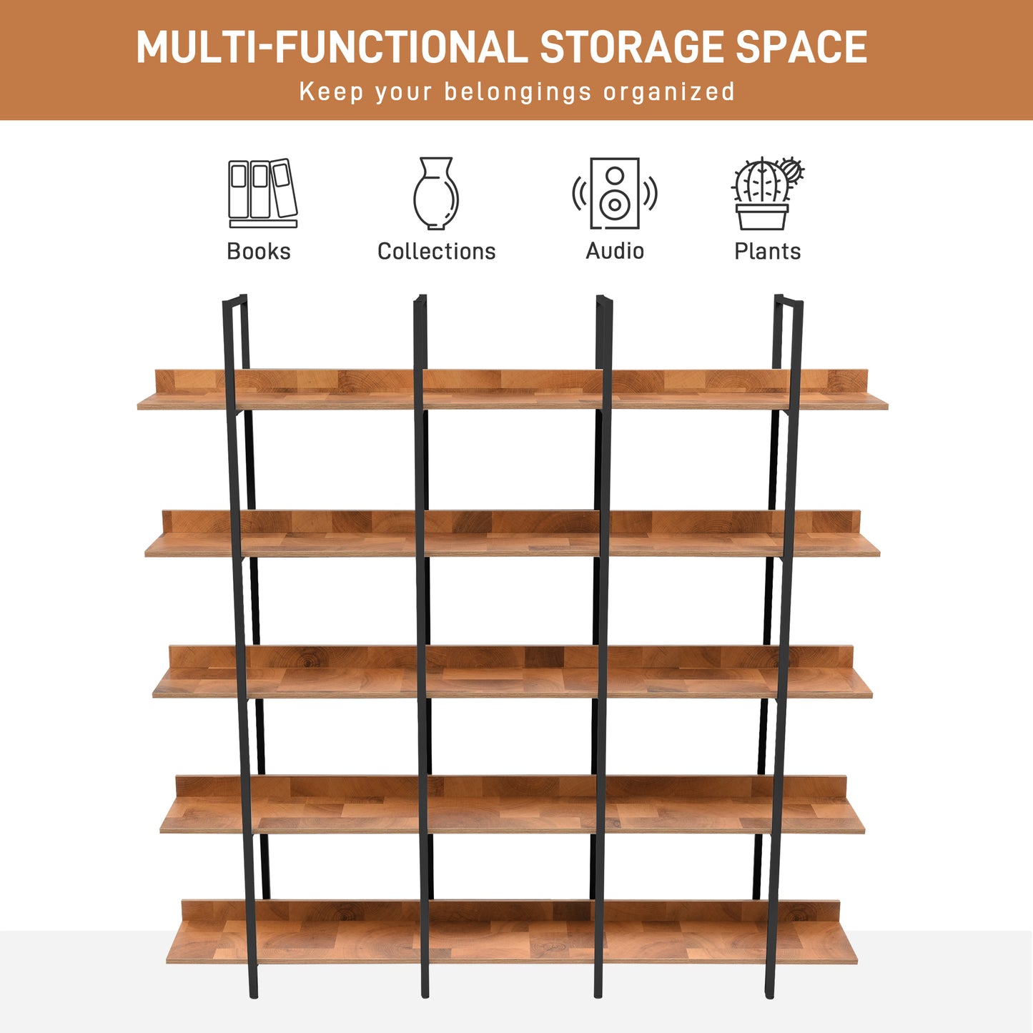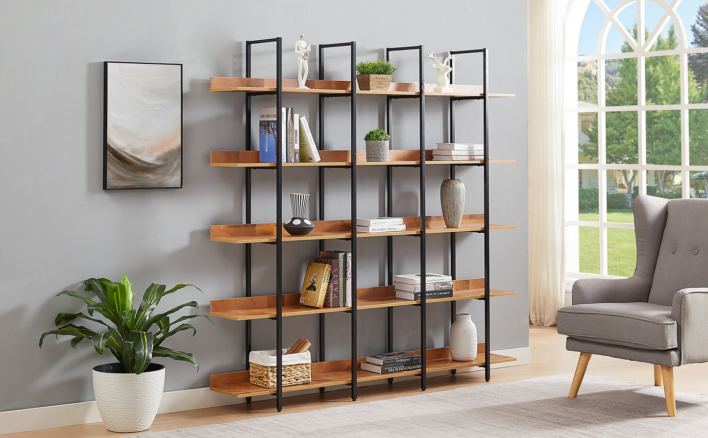 - [Five-tier Shelf Storage] The open design of this bookcase combines the charm of both minimalist and vintage furniture styles. each designed with upright panels to stop things falling off and provides plenty of space to display and storage your books, decorations, plants, and other daily accessories.