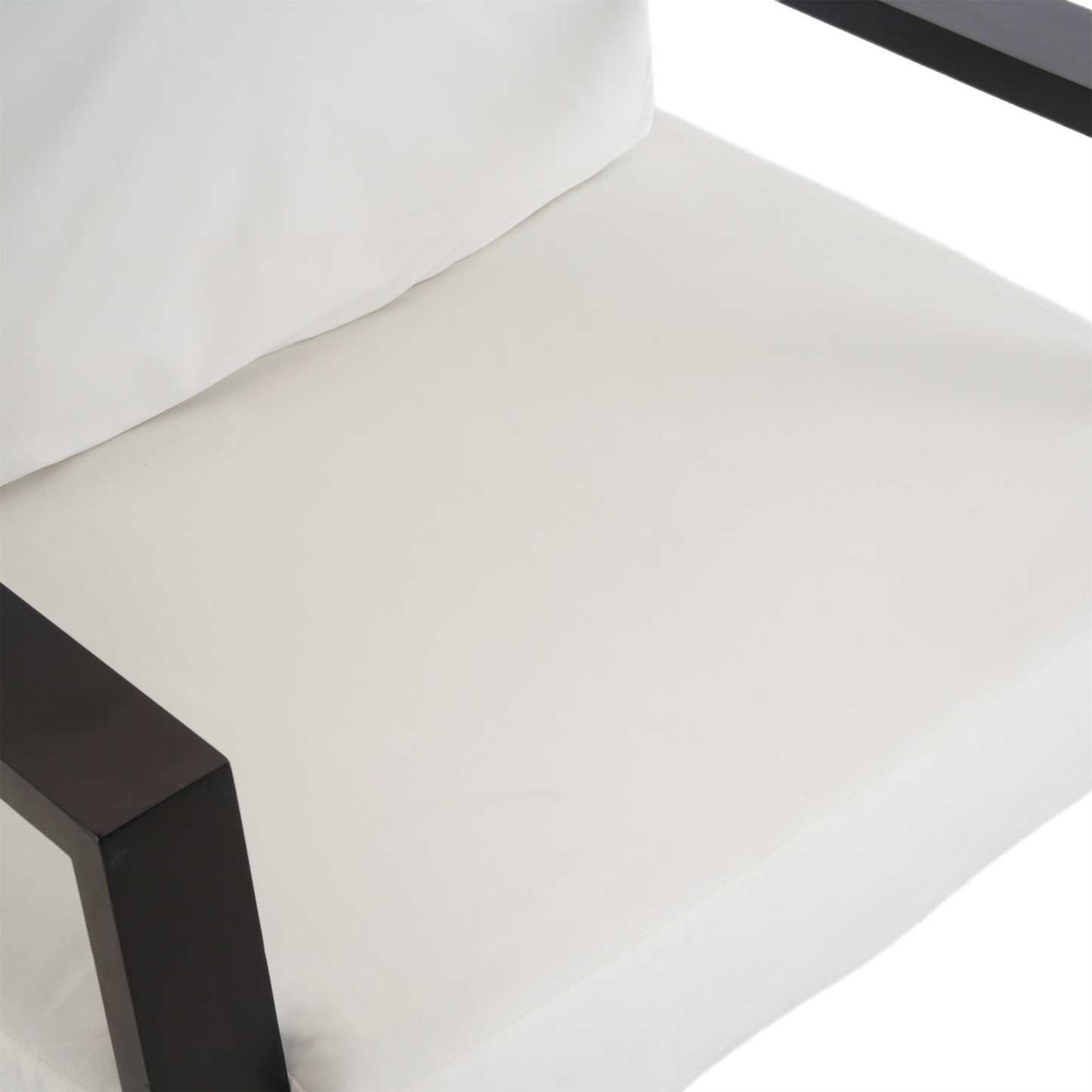 For covered patios or semi-outdoor areas, this chair shines with its durable materials and timeless design. Its white upholstery contrasts beautifully with greenery and other natural elements, making it a great choice for creating cozy, inviting outdoor lounges.