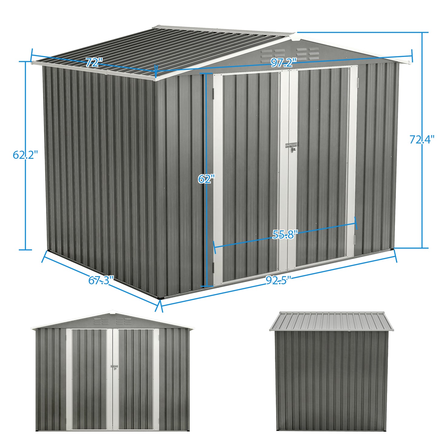 - 【Large Space Storage】 8 x 6 feet (99.6 x 70.4 x 72.6 inches) metal garden storage room Durable galvanized steel reinforced construction makes this durable metal outdoor storage shed rustproof and UV-resistant.Large for shovels, lawn mowers, ladders and other garden tools, easy to install can help you to avoid clutter in your yard, basement or garage. Keep your yard looking clean and tidy.