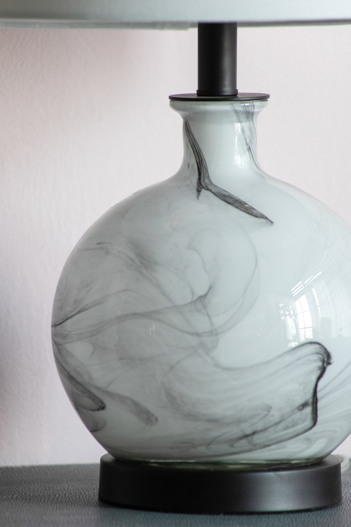 The Round Glass Table Lamp accentuates any modern sideboard or side table. The Swirled design of the white and grey glass and the rounded style of the lamp adds not only illumination but sophistication to any room. Finished with a white linen drum shade, the Table Lamp is a perfect addition to your design.