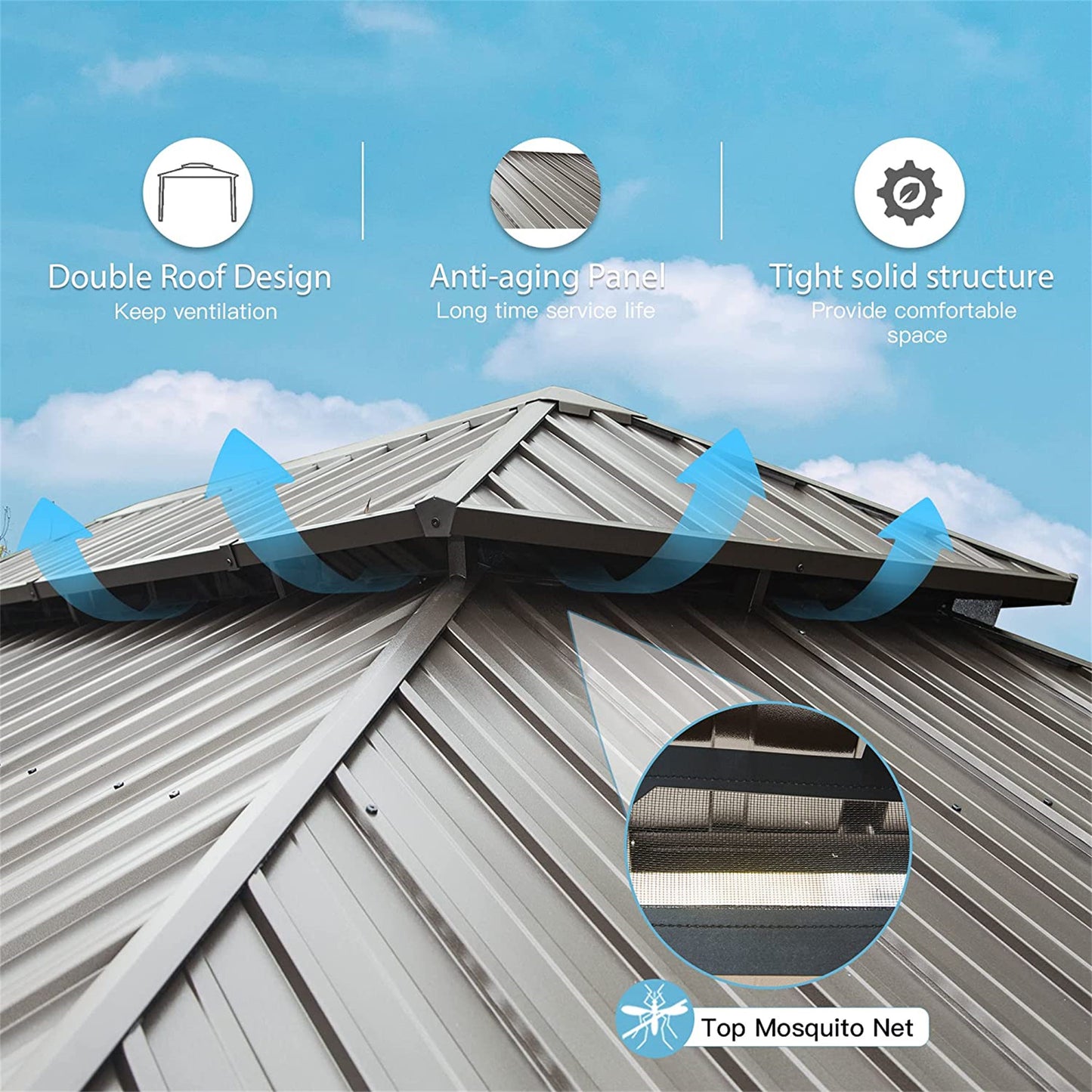 - 【VENTILATED DOUBLE TOP DESIGN】This outdoor patio gazebo designed with a ventilated double-layer galvanized steel roof to provide a healthy and airy space.Features a galvanized steel sheet top that prevents fading and prolongs service life.