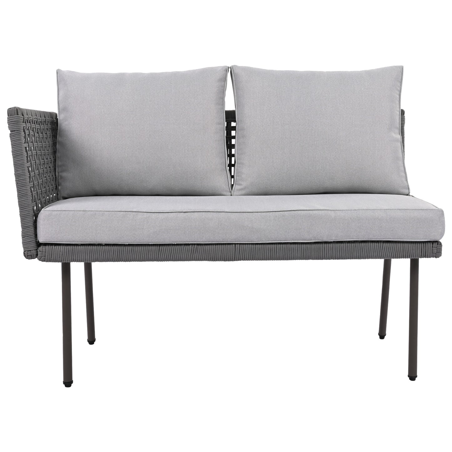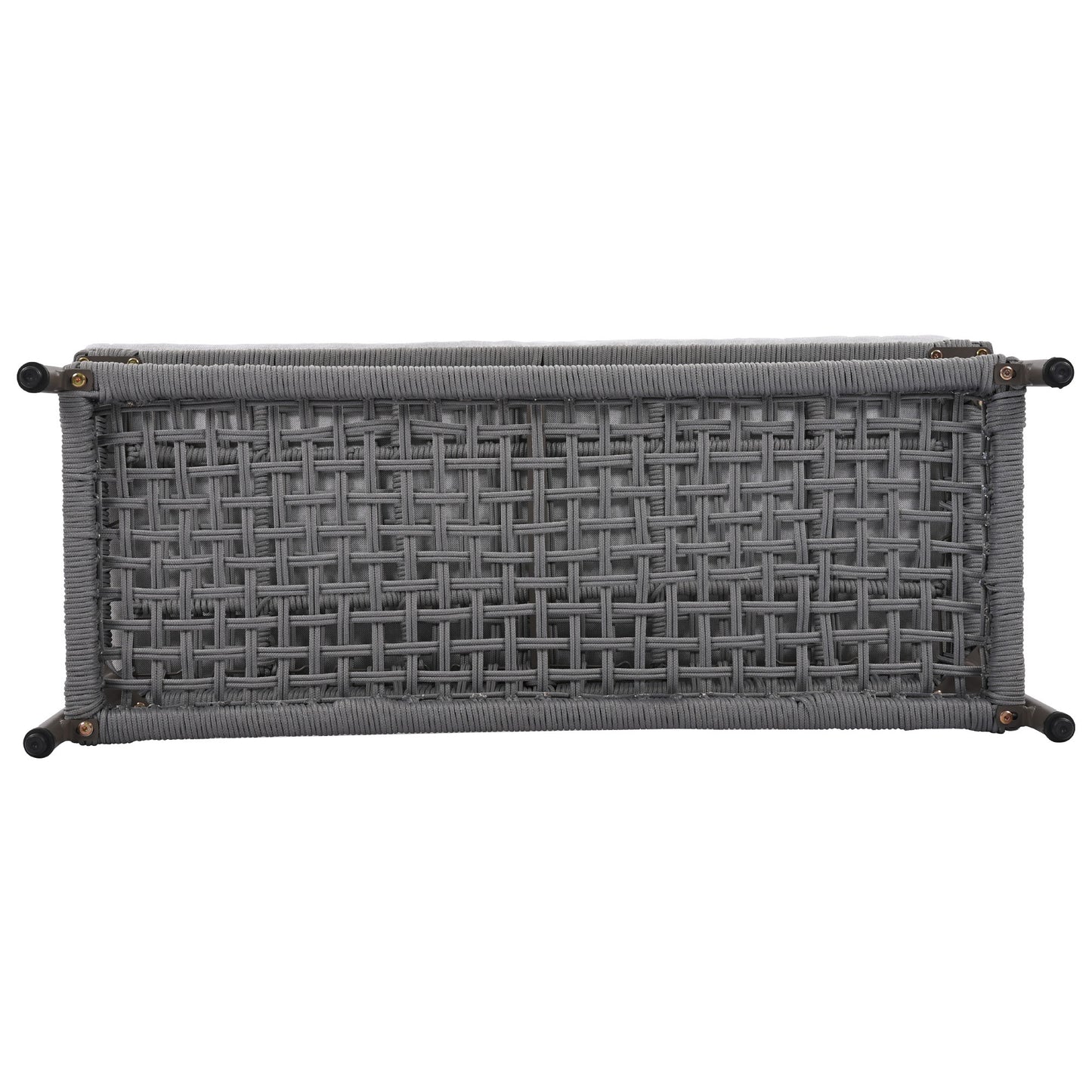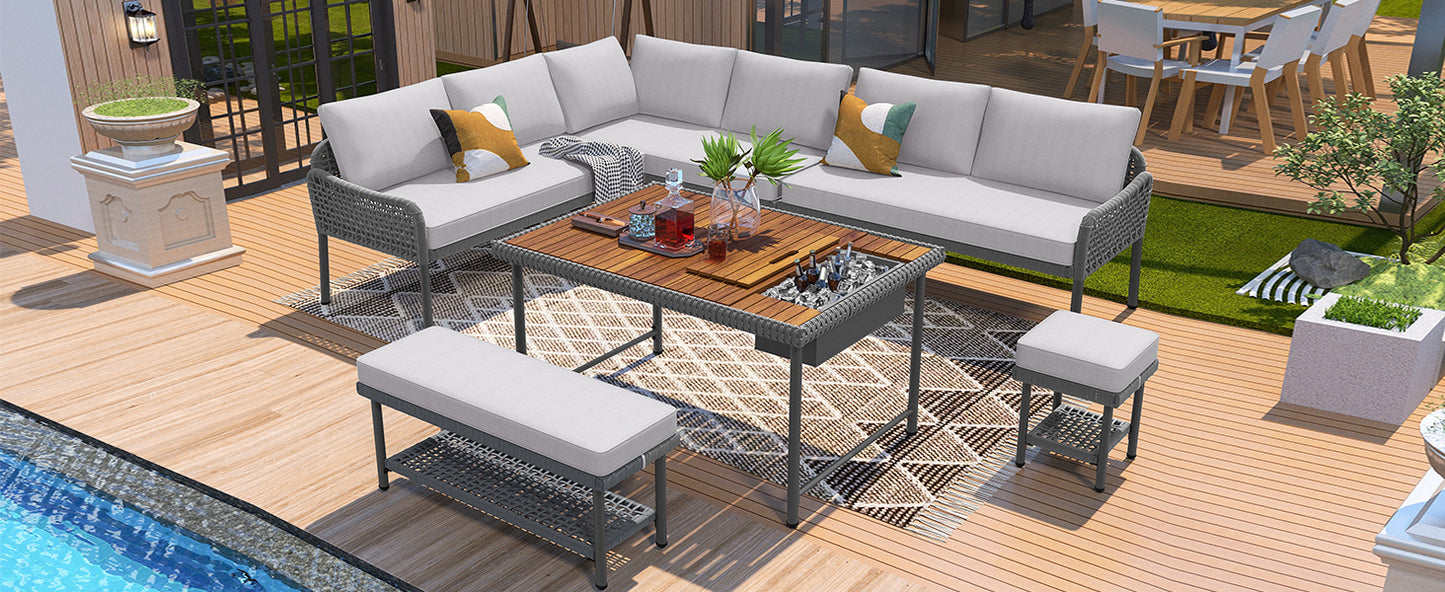 Summary | This 6-piece modular rope weave L-shaped patio set has both a flexible style and an aesthetically pleasing design. The set has 4-inch seat cushions and 8-inch back cushions, accompanied by an overall powder-coated metal steel frame construction. This takes the simplicity and monotony out of your outdoor gatherings. The modular design allows this outdoor set to be custom configured to fit any space. It can either be used as an L-shaped overall set or divided into three double sofa sets. The set also features two rope-woven benches and an acacia wood table with an icebox design, which makes your outdoor living even more enjoyable. The sofa bench cushions come with a zippered design, fade-resistant, spill-repellent, and washable covers. This will definitely suit any family who would like to enjoy the outdoors. |