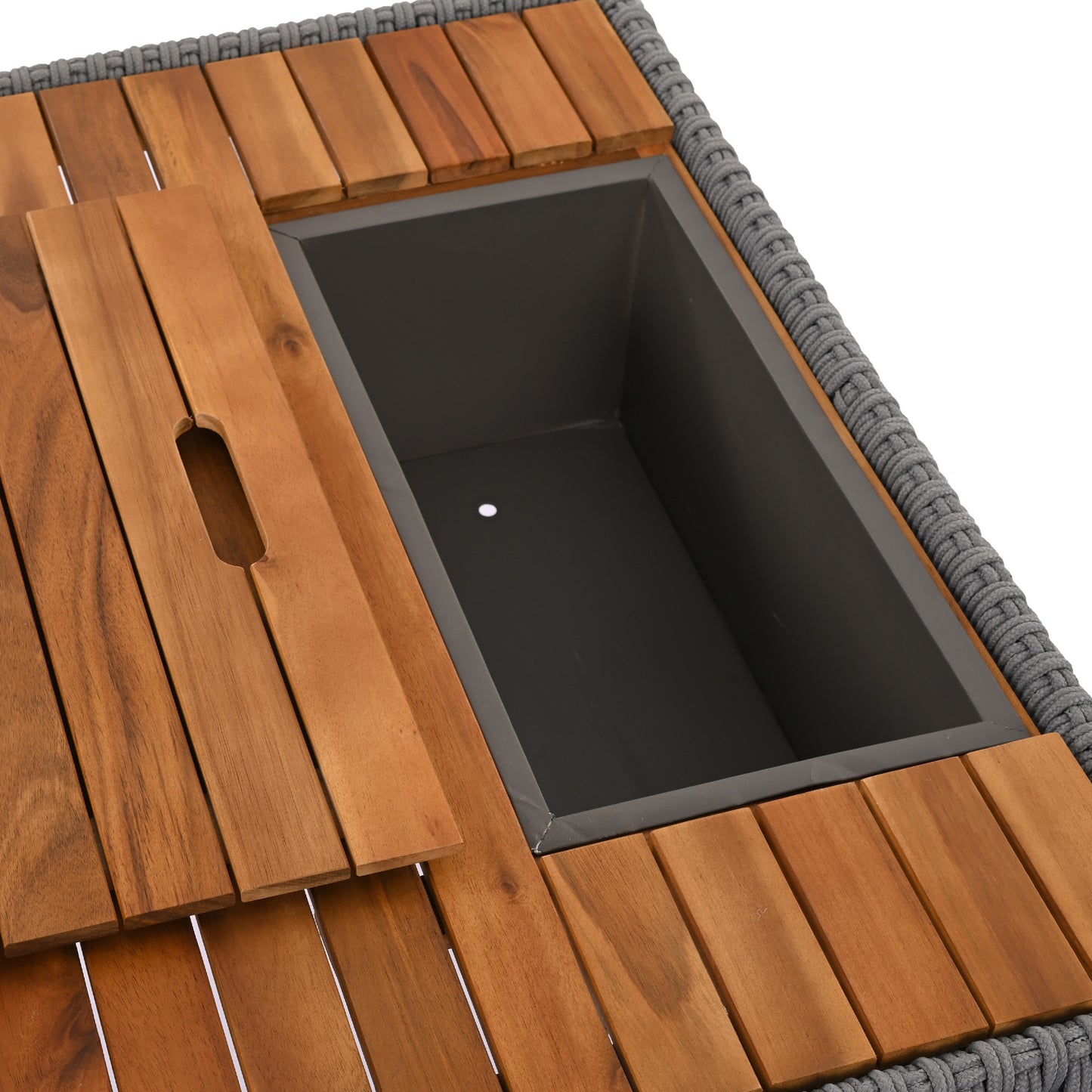 - [Acacia Wood Table with Ice Box Design]The outdoor sofa set comes with an acacia wood table. The table top has a unique ice box design. It measures 15.8 x 7.9 x 7.1 inches overall. You can use it to store some of the ice cubes. This can enable you to feel the cool charm outdoors even in the hot summer days. With the perfect sized wooden lid, it can effectively prevent heat.
