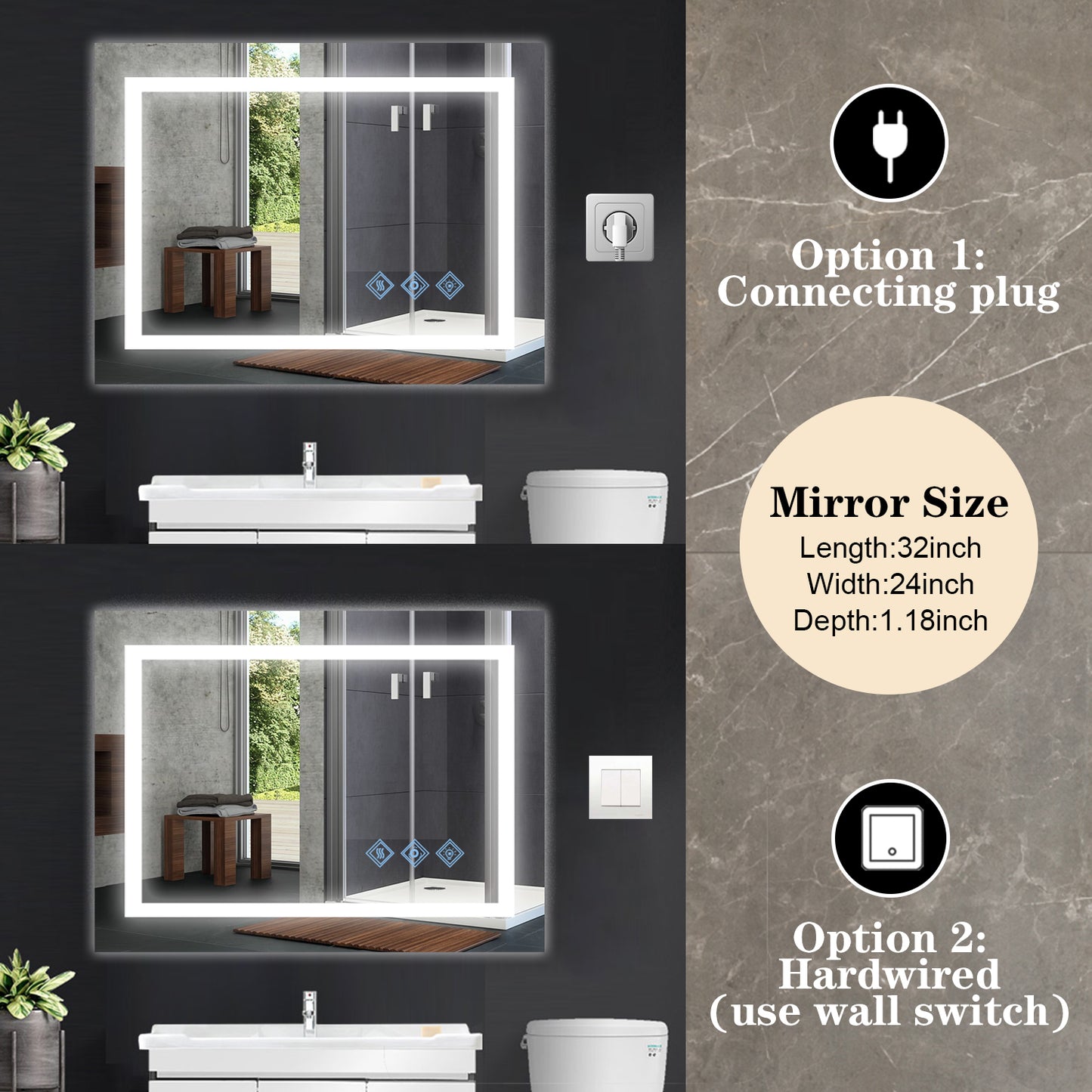 - [ANTI-FOG] : Starting anti-fog function immediately when you turn on the anti-fog button, it need 5-10 minutes to clear this led bathroom mirror completely, safe and energy-saving, so open this function in advance before you use it(May need more time in Winter)