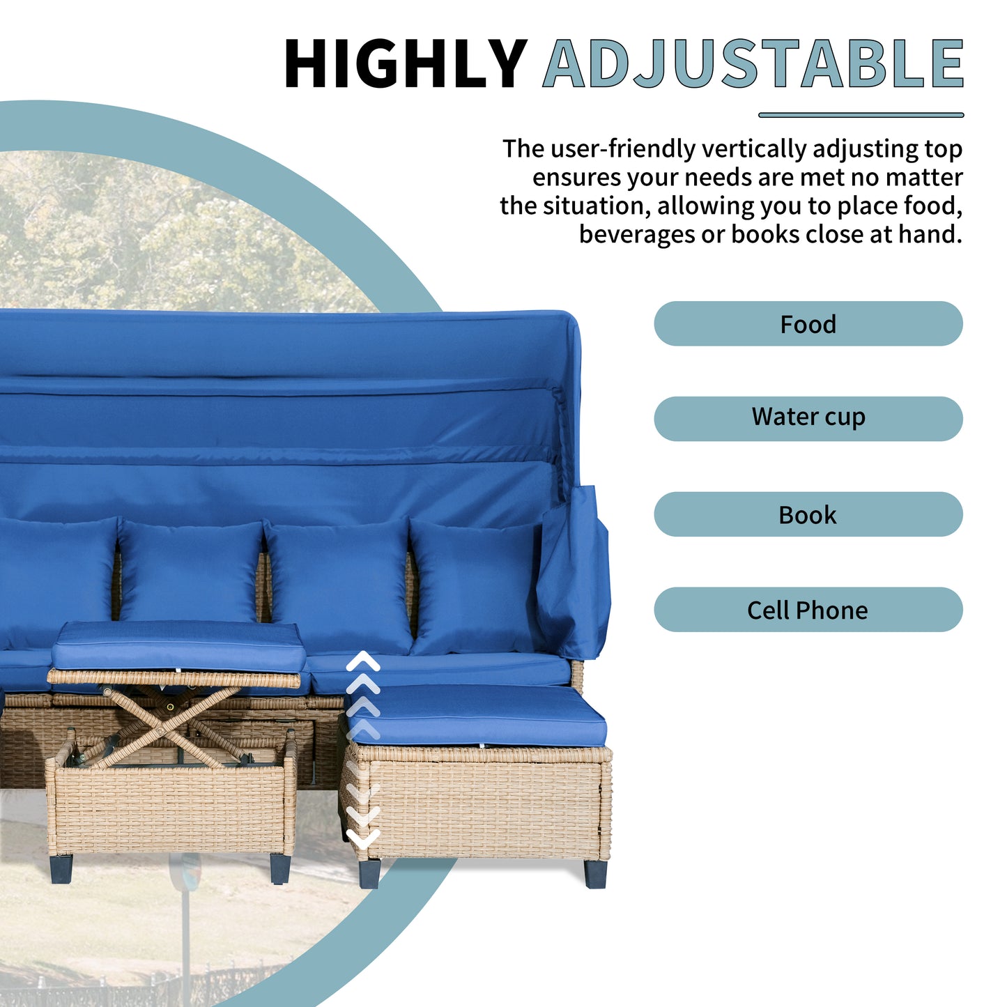 Lucvara 4-Piece Outdoor Patio Sofa Set – UV-Proof Resin Wicker Sectional with Retractable Canopy, Cushions & Adjustable Lift Table, Blue