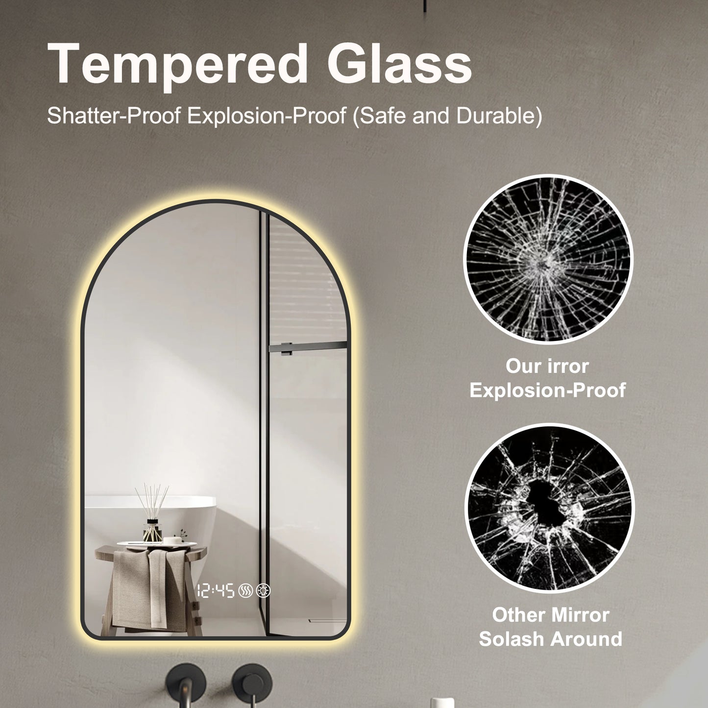 - Sleek and modern black arched LED mirror design. Sturdy black aluminum frame ensures long-lasting use.