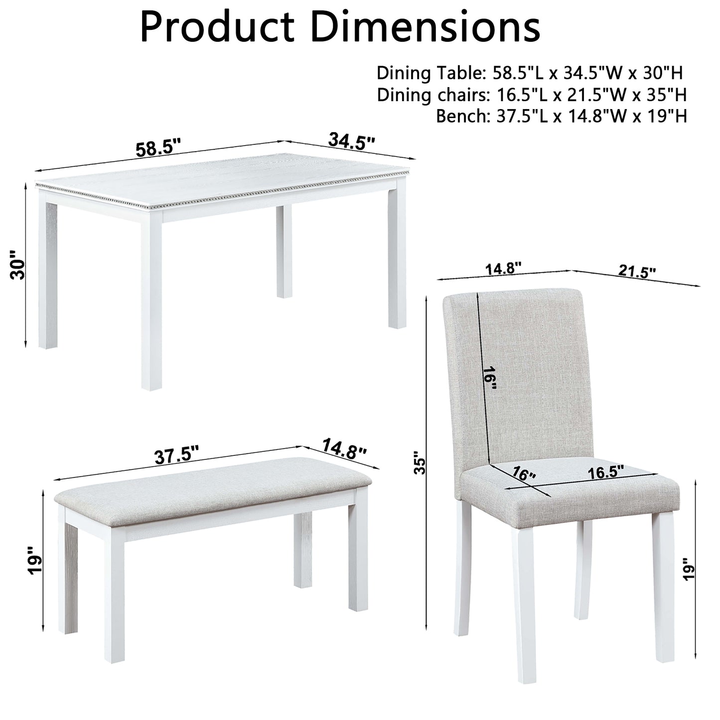 - Dimensions and Assembly: Overall Product Dimensions: Dining Table: 58.5'L x 34.5'W x 30'H; Bench:37.5'L x 14.8'W x 19'H; Dining chairs:16.5'L x 21.5'W x 35'H.Dining table and chairs are packaged and delivered to your door in two separate boxes, with all the tools you need to assemble the table and chairs, just follow the instructions for easy assembly.