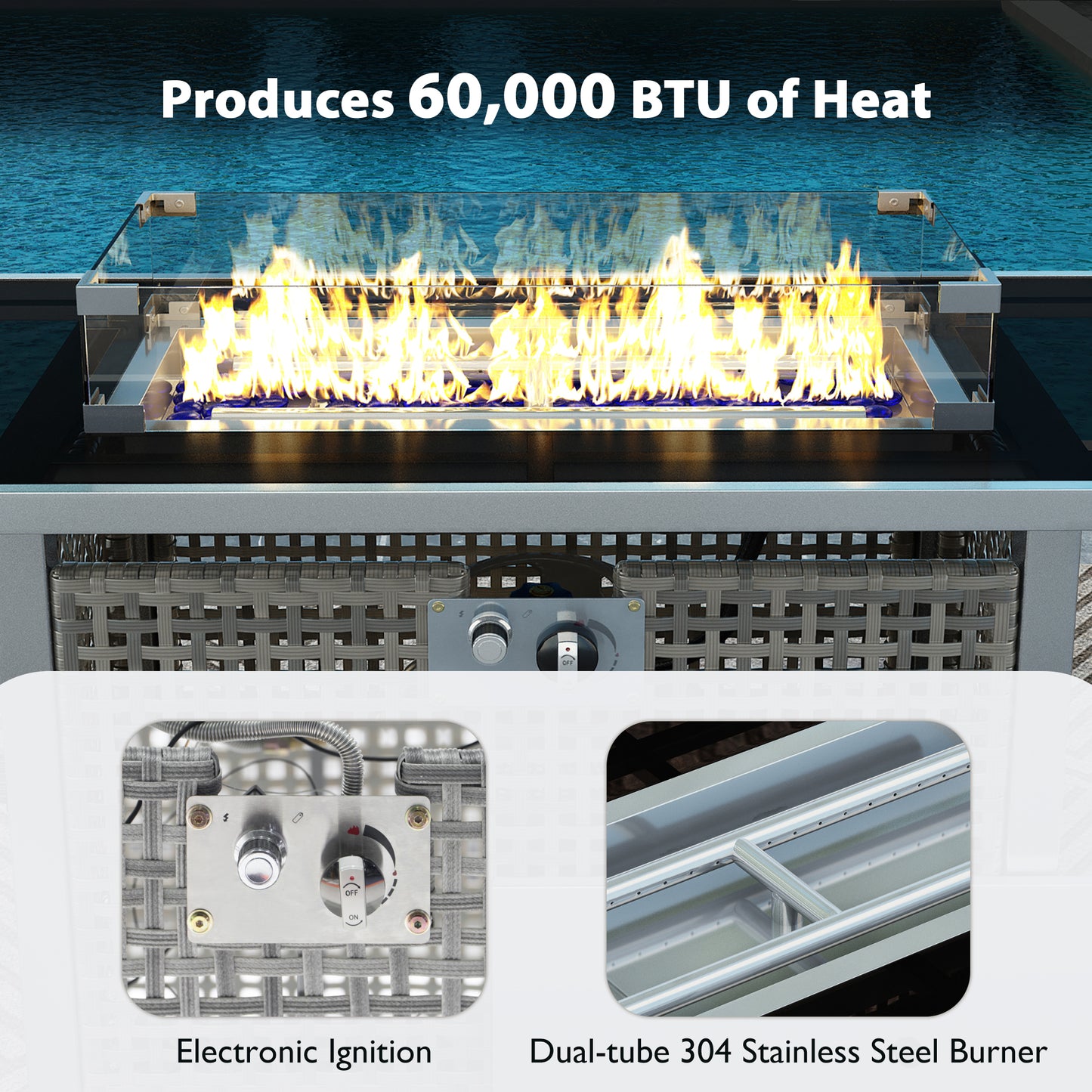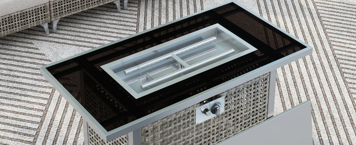 Highlights | [1000H UV Resistant Wicker with Open Weave Design] [CSA certified 60000BTU Stainless Steel Burner] [Fire Glass Beads] [43' Open Weave Propane Gas Fire Pit Table with Tempered Glass Table] [External Spark Ignition][Wind Guard Glass][Adjustable Feet Design] |